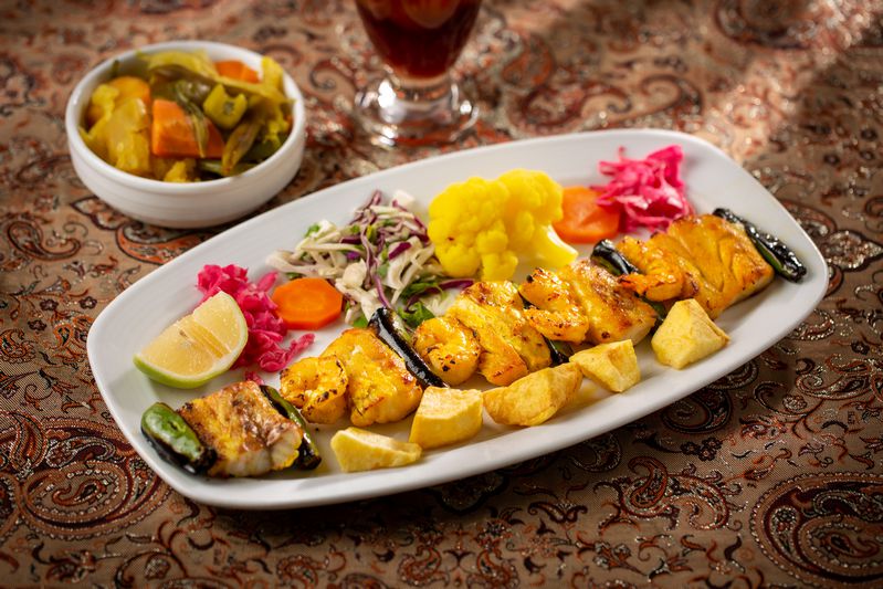 Four Skewers Kebab-E-Koobideh, One Skewer Chicken thigh Kebab, , Trout Fish, Chicken Tempura, 3 Rice